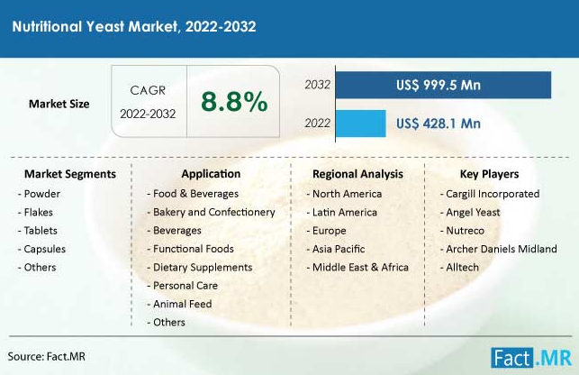 The predicted market expansion for nutritional yeast over the next 10 years: from US$ 428.1 million up to US$ 999.5 million. Here you can read the full report.